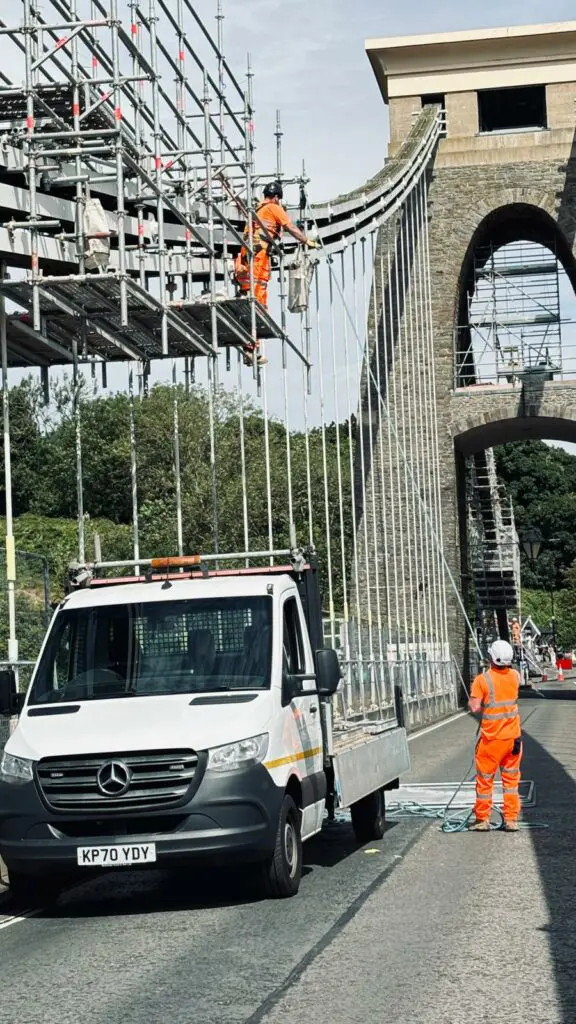 It much trickier to work on the chains at a height over 4 metres. To work safely on these, scaffolders assembled ‘painting pods’. You’ll see the pods on the main span of the chains where workers have now started painting the chains curving up from the centre towards each of the bridge’s towers. Assembling the pods is no easy feat: the scaffolders are working approximately 100 metres above the high tide with a view right down to the bottom of the gorge! Although they are wearing full PPE and fall arrest harnesses it’s not a job for the faint-hearted!